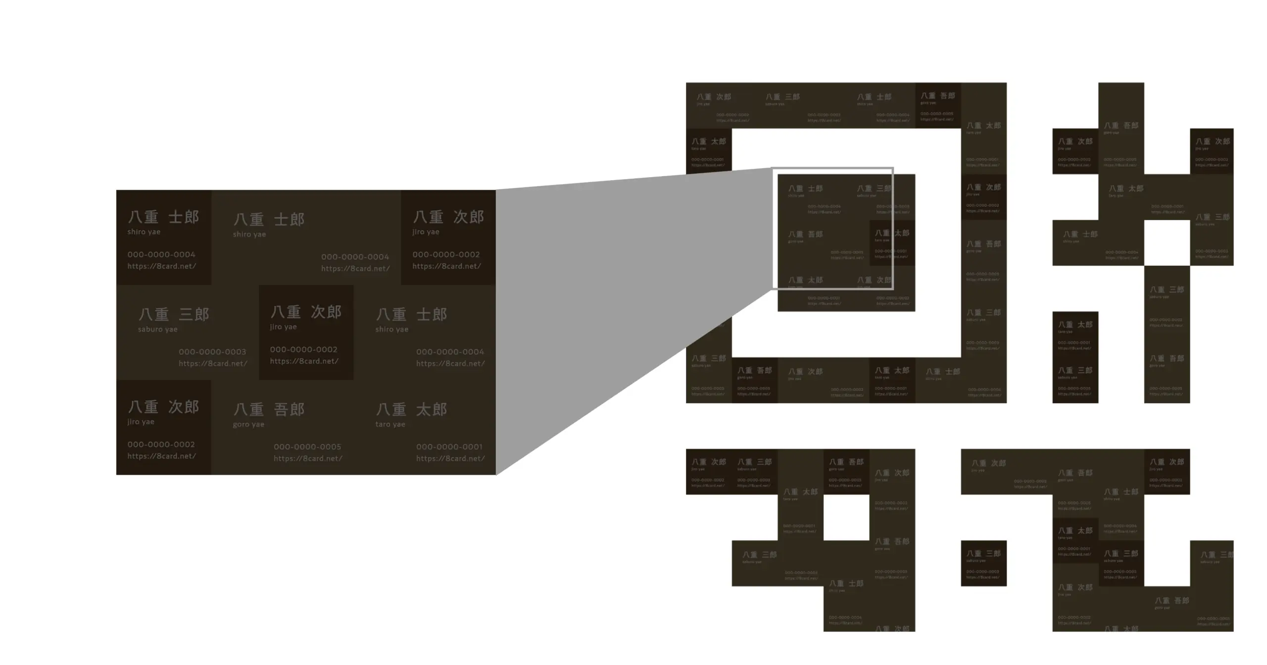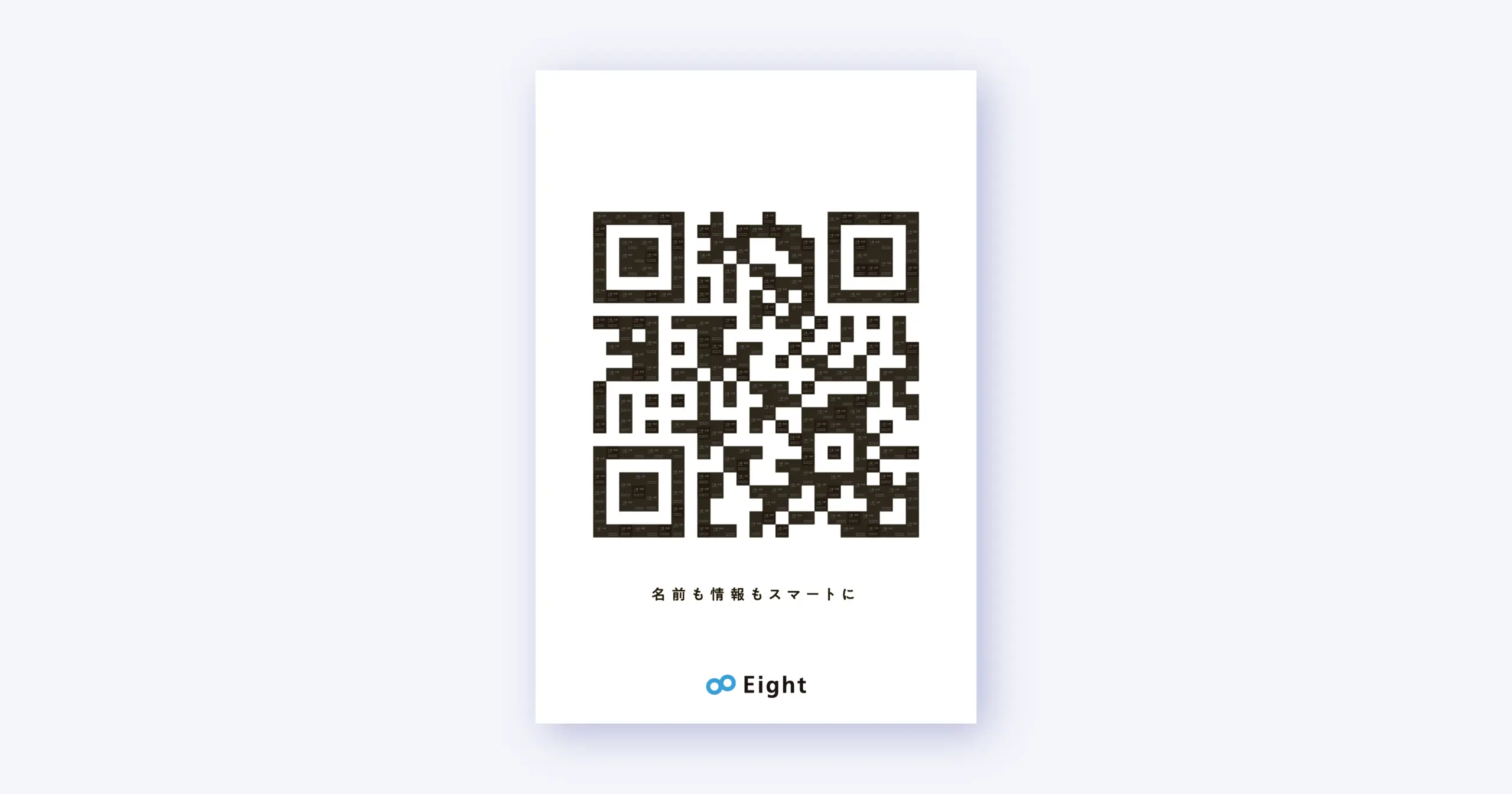課題の一部に、表現の際の注意事項に、「『Eight』への誘導を含む二次元コードの掲載」という要望があり、それがアイデアの起点となりました。 名刺交換時に特に重要なのが「名前」「電話番号」「メールアドレス」等の目の前の人物に関する情報です。この情報を1つのマスに記載、そのマスが集まって二次元コードを形成しているというデザインで、「二次元コードの読み取りひとつで、その人の情報にアクセスできる」ことを表現しました。 結果は、応募総数440点の中からファイナリスト20点の1つに選出されました。